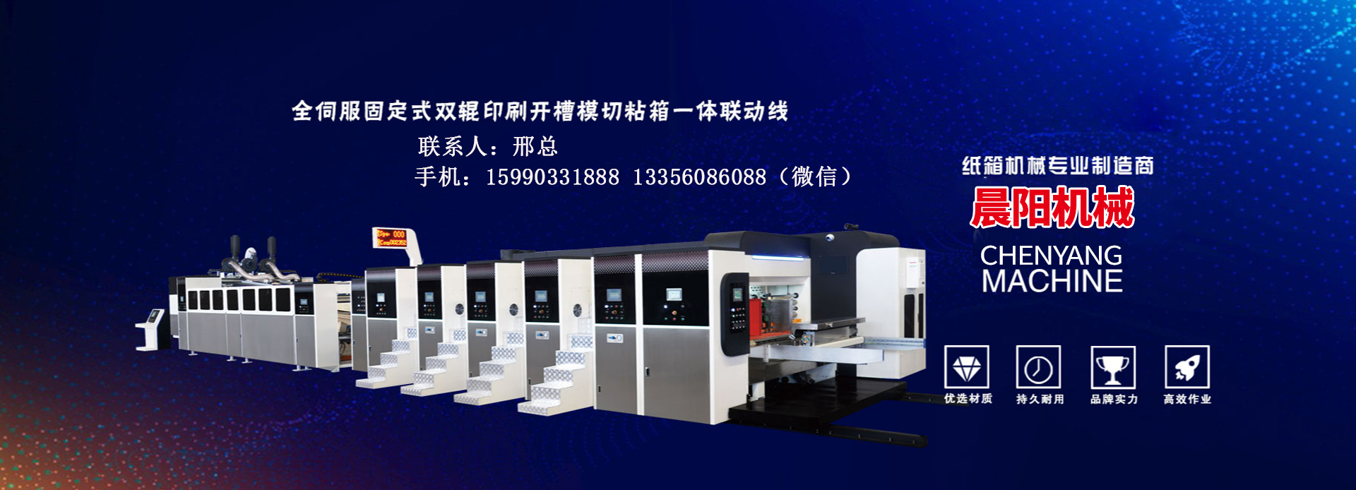 晨陽公司自成立以來依靠良好的信譽和產品質量在同行業中名列前茅,使公司的規模不斷擴大,產品質量不斷提高和完善,多元化,多地化發展分類出幾個不同產品的專業機械制造公司。 公司生產的產品遠銷各地,在客戶中廣泛的使用和推廣,深受客戶的好評和喜愛。 我公司生產的柔版印刷機,高端水墨印刷機(聯動線),全(半)自動釘箱機,瓦楞紙板生產線等產品在國內外市場中具有良好的競爭力。 我公司一貫信奉“質量優良,以誠會友,科技興企”的經營和生產理念,始終產品的質量,以客戶的滿意為的追求。公司的理念是“合作、創新、求進、發展”。我公司以服務...